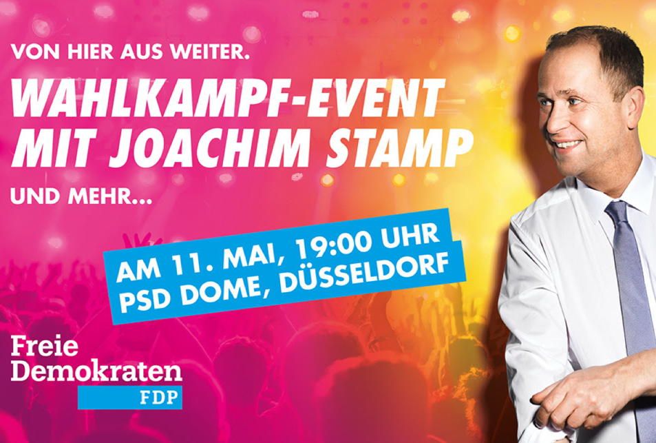 Am Mittwoch, den 11. Mai läutet die FDP-NRW mit unserem großen Wahlkampf-Event in Düsseldorf die Schlussphase des Wahlkampfs ein. Wir freuen uns sehr, wenn Sie vor Ort dabei sind und unseren Spitzenkandidaten Joachim Stamp noch einmal kräftig unterstützen. Neben der Einbringung eines Wahlaufrufs steht dabei vor allem die Rede des Landesvorsitzenden im Mittelpunkt. Neben unserem Spitzenkandiaten Joachim Stamp und einer Reihe interessanter Gäste, wird es auch Live Musik und spannende Überraschungen zum Wahlkampfendspurt geben. Also nichts wie hin: